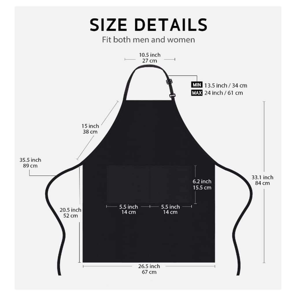 • Wide Coverage – Large bib Apron that covers from chest to knee provides great coverage and protection from kitchen grease, spills and food stains. Note: do not place apron nearby any heated cooking ware or flame.